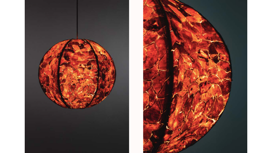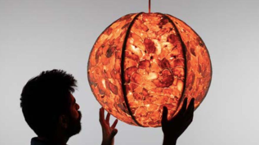 Designer Alkesh Parmar, of Studio Arp, "Citrus Sinensis" project brings a fresh perspective on sustainable design by transforming discarded orange peels into a leather-like material which is then used to create a lampshade. The peels are carefully processed through a handcrafted technique known as APeel, turning them into a resilient, pliable material with a leather-like quality that showcases the peels' natural textures and hues, making each piece visually distinct. Through extensive research, Parmar discovered that peels, when handled just before completely drying, act as a flexible leather alternative. During this short period, the peels are pliable and can be manipulated based on factors like the age of the fruit, its type, and environmental conditions. Once dried, they harden into a durable material. APeel, tackles the issue of citrus waste in the food industry by exploring the potential of orange peels as a versatile material