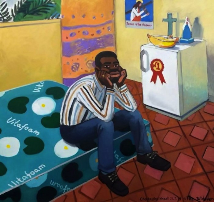 Ukraine-born Zoya Cherkassky-Nnadi has taken a natural liking to Nigeria. After her first visit to Enugu state, her partner’s hometown, in 2013 she picked up the brush and painted what she saw. The paintings illustrate daily situations in the village such as taking a midday nap, watching television, family gatherings, the return of an uncle from the diaspora, and the local market.