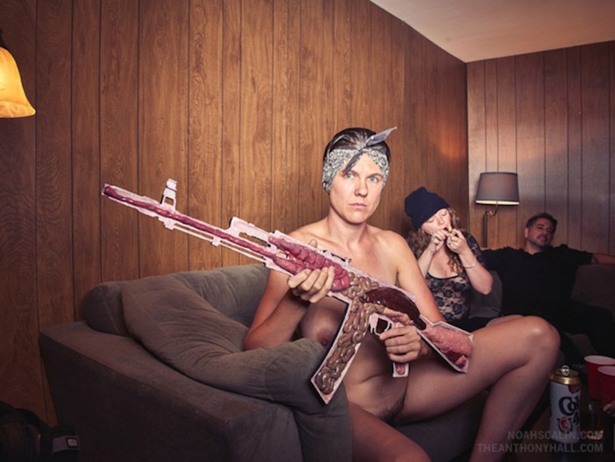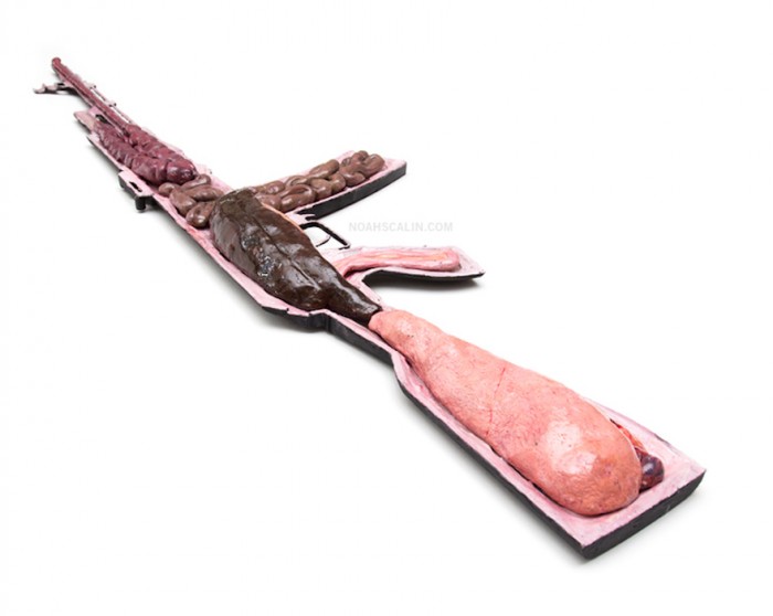 “These guns have been clinically dissected revealing a remarkably human set of internal organs,” explains Scalin. “The objects become as fragile as the lives that they can potentially take. In addition, the guns become a physical extension of the body of the user of the weapon, albeit one with a conspicuously absent brain.”