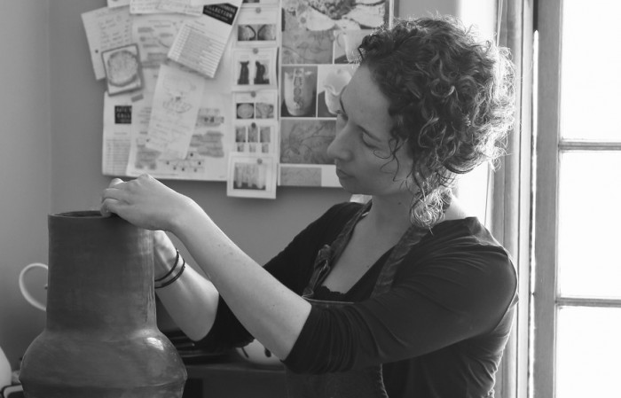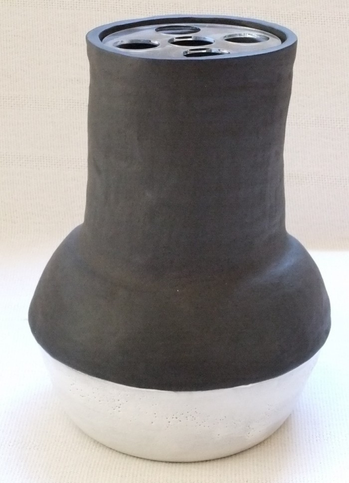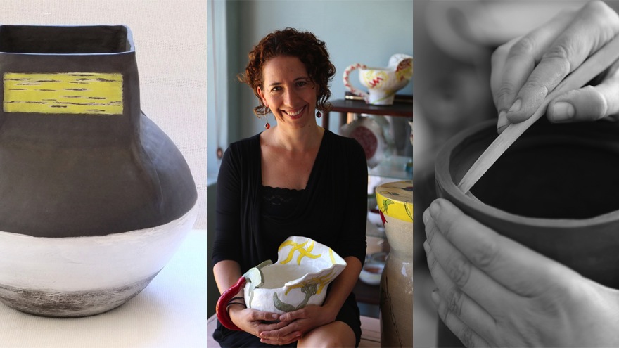 Rosenberg works with terracotta earthenware and porcelain white clay but predominantly with black clay. Most areas of her pieces show the colour of the clay with feature areas she’ll glaze in bright colours or metallics, or give a different finish.