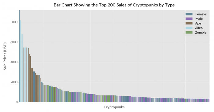 As expected, alien cryptopunks sell at the highest average price. However, the most expensive Cryptopunk to date is a female type. The graphic below shows the largest sale from each type of Cryptopunk: