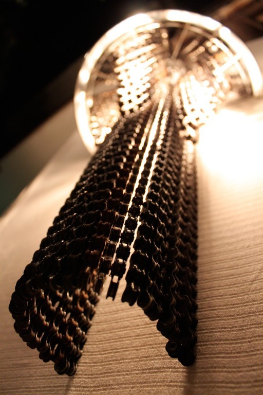 Connect address issue of class codes, power dynamics, reclaiming potential and ecological responsibility, says Fontoura Alzaga in her artist’s statement. “In this series the traditional chandelier is seen as a bourgeois commodity and the bicycle parts as a symbol for self-propelled movement. These subversive objects challenge the aesthetics of wealth by visually contrasting the classic elegance of the candelabrum with the newfound elegance of discarded, mechanical bicycle parts.”