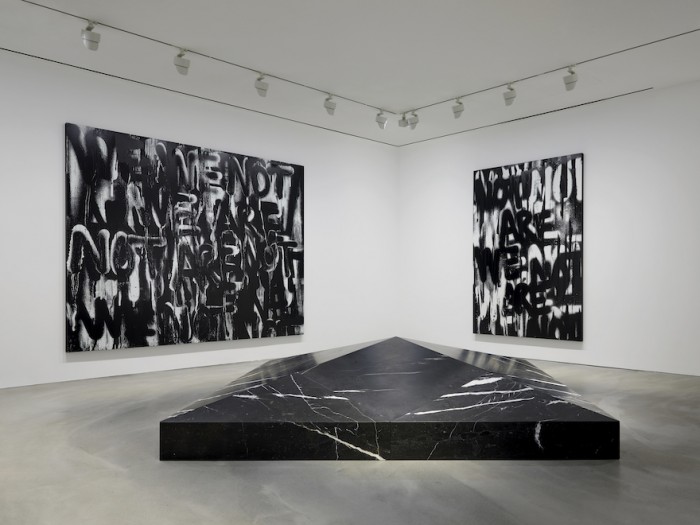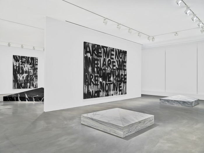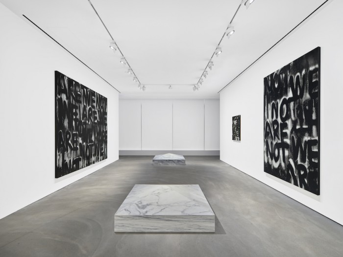 Through a sustained and multifaceted engagement with painting, Pendleton’s work explores the tensions between language, representation, and abstraction. The paintings on show enunciate three simple words: we, are, and not. This forms a complex matrix of meanings, which draws on the artist’s seminal Black Dada text of 2008.