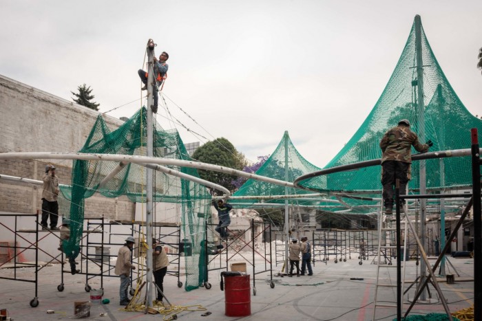 An outdoor installation occupying the plaza of the High Museum of Art in Atlanta, USA, references trees and the flight patterns of migratory birds. Called MURMURATION, it will provide both seating and shade, the netted canopy. The bright green mesh structure is made from architectural netting pulled over a metal framework.