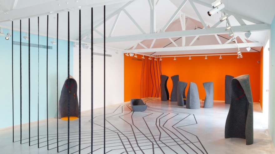 Made from felt, the “Permanents” include a chair, cabinet, portrait gallery, wooden bell and various puppets, all constructed around a unique form that envelopes the human body. The puppets are showcased through various human activities; namely standing, sitting or laying down. The pieces are staged in their simplest form and draws on colours that evoke certain responses in human behaviour. Orange areas highlight an invitation to read, sit, lie down, see and listen.