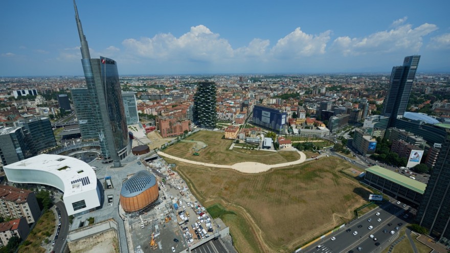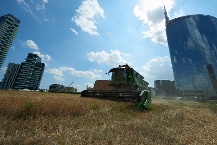 Fast forward to Milan, 2015. In February city planning group Fondazione Riccardo Catella replicated the Wheatfield earthwork in downtown Milan in partnership with contemporary culture initiative Fondazione Nicola Trussardi and Italian agriculture organisation Confagricoltura. Members of the public were invited to sow seeds across 12 acres of land in the Porta Nuova district as part of an urban renewal plan to reshape the city’s skyline.