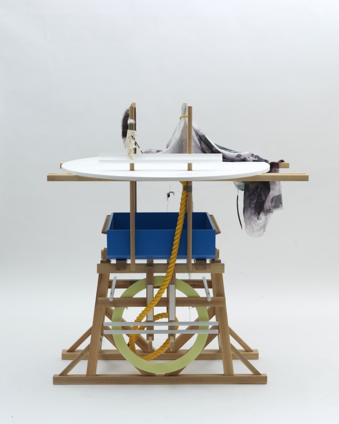 The Big Shelf is made using printed cotton, leather, Icelandic nylon ropes, fox fur and black feathers. “For this piece, I tried to create little scenes or scenarios that are midway between miniatures and decoration,” says Sigurðarson. Using hundreds of white ropes that flow down, Sigurðarson creates the idea that a hidden treasure lies beneath the white waterfall.