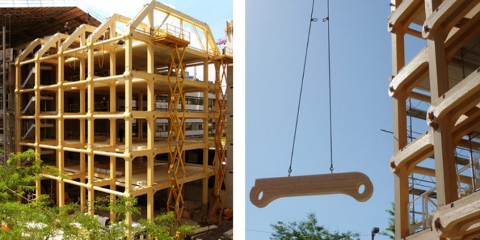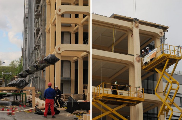Using the Japanese master carpentry method of eliminating the need for joint hardware, nails and glue in its construction, the structure is made entirely of timber, which interlocks into a network of nodes. The structural system is four storeys high and is enclosed by a glass skin for an enhanced impression of contemporary innovation in architecture.