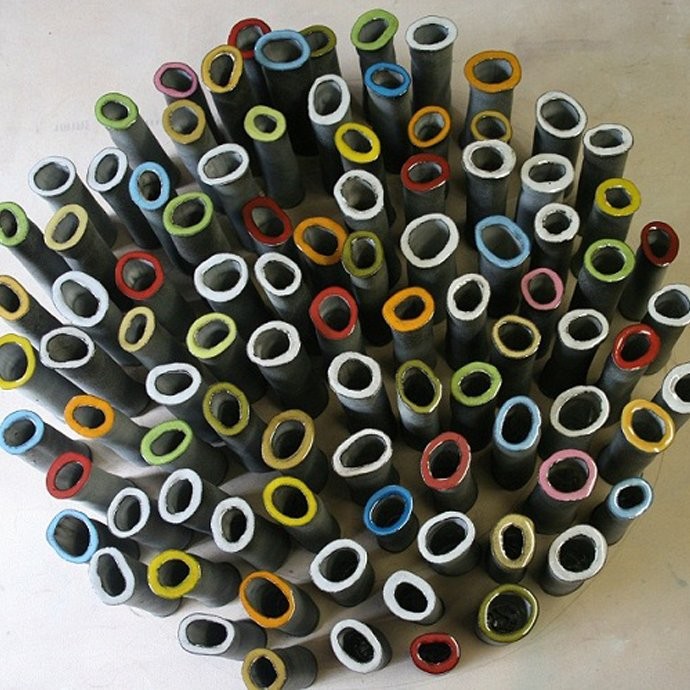 Happy Birthday Madiba is the title of Hennie Meyer’s ceramic work that consists of 93 small vases, finished in a variety of vibrant colours.