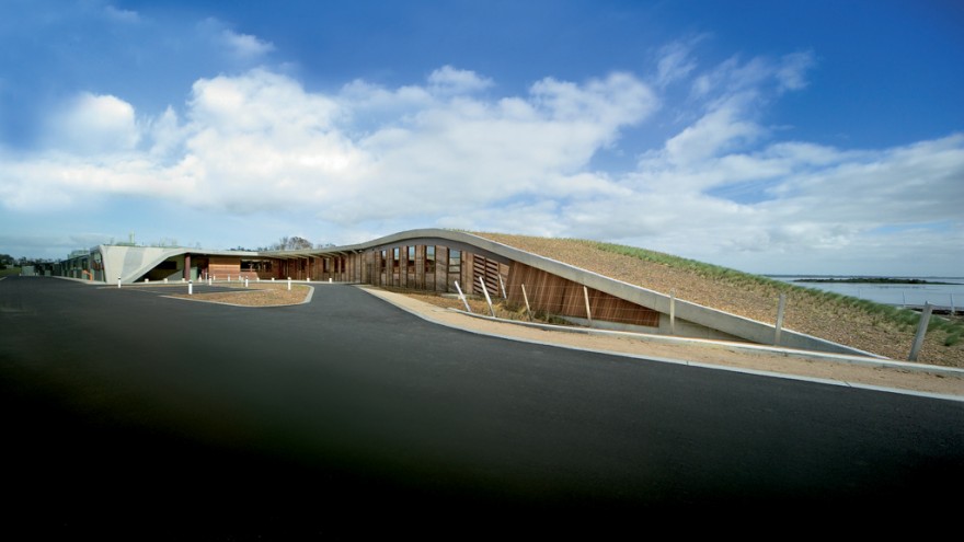 The centre has been designed in a unique way - almost from the inside out. The concrete structure is exposed on the inside and timber cladding insulates from the outside, maximising the benefits of thermal mass. Its walls and ceiling absorb heat in summer and naturally warm its interiors in winter. The grass-covered roof also helps in this process.