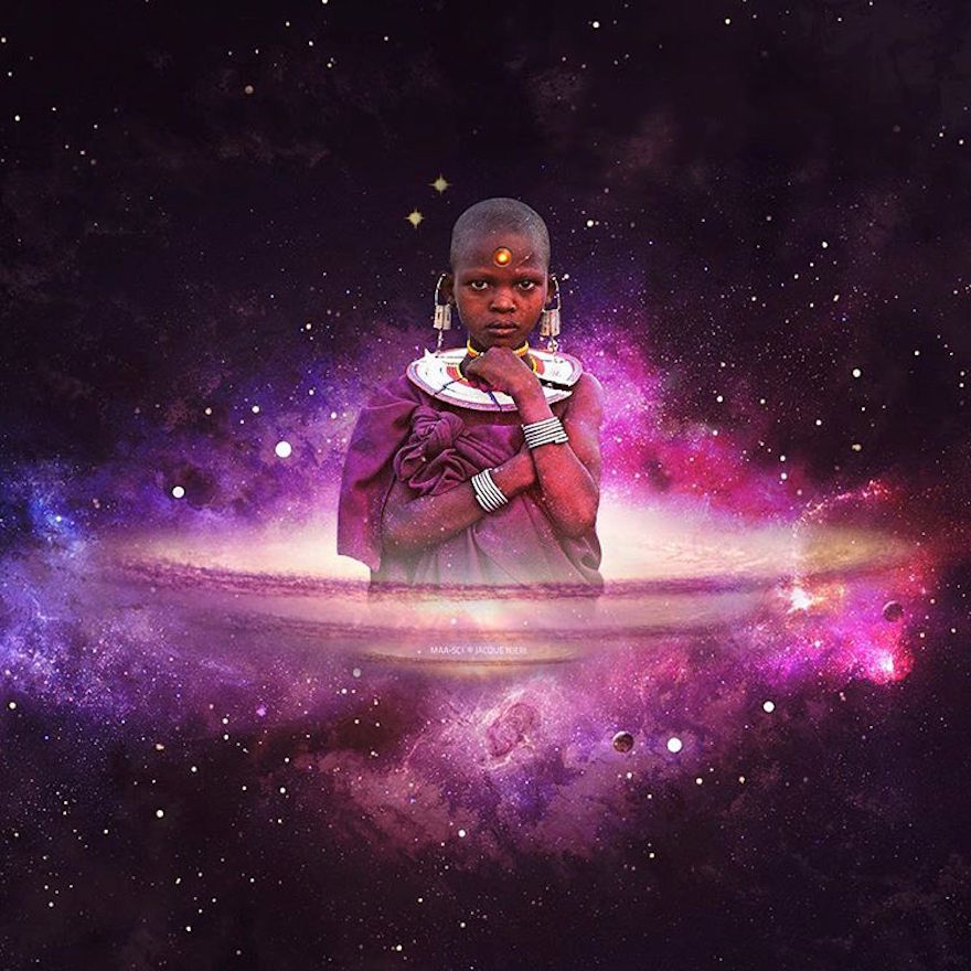 In MaaSci, Njeri presents a collection of digital collages that imagine the Maasai in outer space. Cloaked in traditional blankets, a trio of men are seen floating through the galaxy on a flying saucer. Another image sees a young boy carrying a spear and a black-headed lamb as he walks among the clouds toward another planet. Others feature Maasai women as cyborgs, astronauts and more.