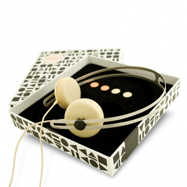 The on-ear headphones are composed of a stainless steel headband with a single brace design of “tracks”. The slider connectors, basic sound unit and detachable open-cell foam ear pads are available in a range of colours that can be interchanged.
