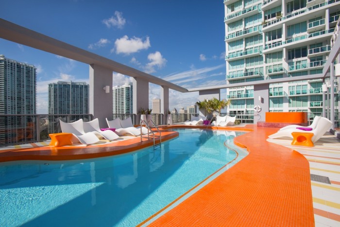 Injecting his signature style and love of bright colour and bold patterns into the architectural project, Rashid opted for a bold orange and white colour palette for the interior and exterior, as well as daring patterns imprinted onto the ceilings of MyBrickell.