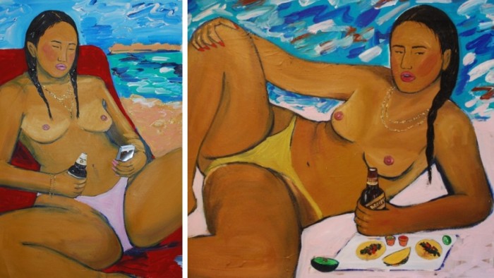 Monica Kim Garza, who works as both a ceramicist and painter, attempts to create pieces that celebrate the healthy female body. Painting and sculpting women (primarily in the nude), Garza places her luscious models in contemporary situations: on motorbikes, surfboards and sitting in bed looking at their cellphones. Using bold and vibrant sketches the half Korean, half Mexican-American artist draws influence from hiphop music and strong female artists such as Frida Kahlo and Selena.
