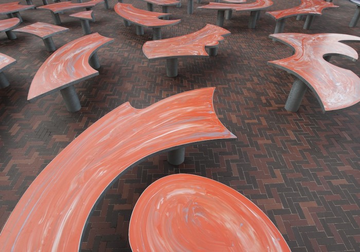 The space subtly merges a modern culture with the more ornamental forms of old Amsterdam. Baroque elements inspired by the Concetgebouw, a concert hall in Amsterdam, are combined with tribal design creating a new dynamic space. A durable polyurethane coating is used on the surface of seating units, which was hand-poured in different colours to create organic tidal patterns that accentuate the flow outwards from the central podium.