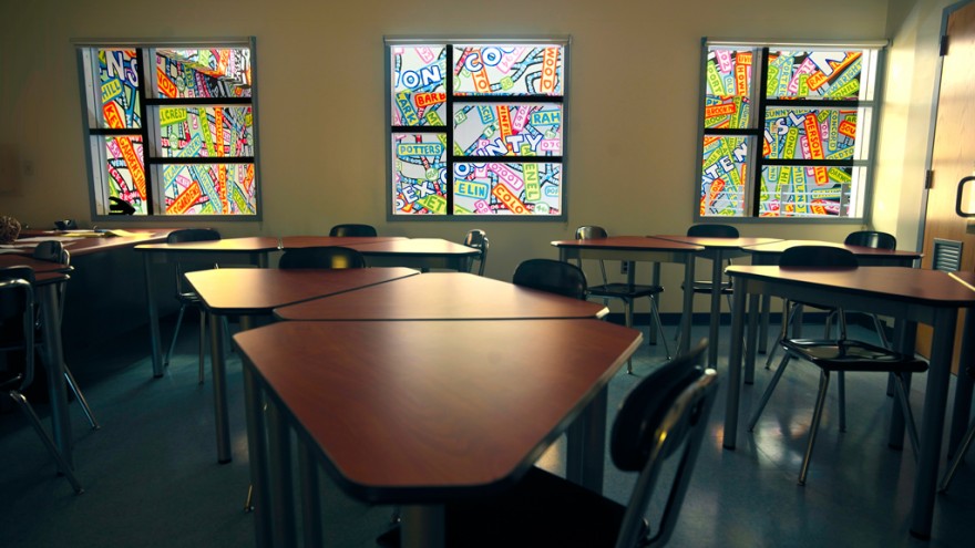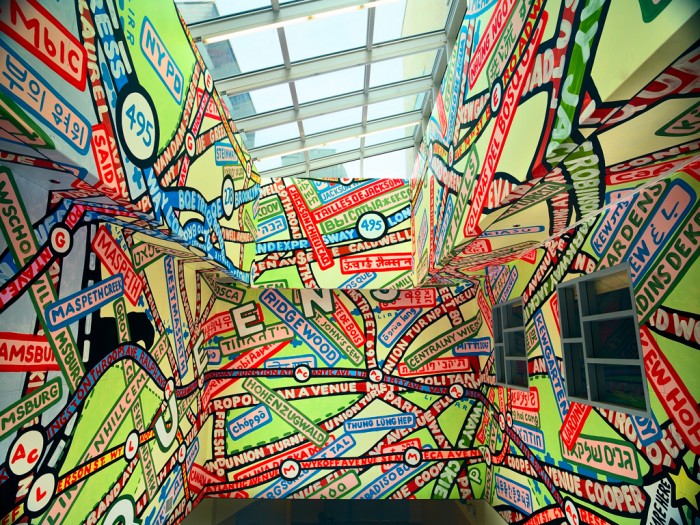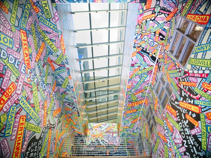 Covering some 740 square metres each, the two murals are located in an atrium and commons at the Metropolitan Campus. In the murals, New York City sprawls across the walls in bright colours, going around the walls, into the corners and onto the ceiling, creating a world in one room. Scher purposefully misspelled or misidentified locations in the murals, as if she is figuring out the geography along with the students.