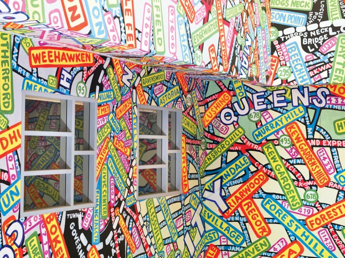 Scher explained that these works combines her love of painting maps with her love of environmental design. “When the viewer enters the atrium, they have entered the painting. They are enveloped by it. Space is altered by it. For that moment in time, all perspectives are skewed. The viewer gets to inhabit Queens in a manner at once, totally familiar and bizarre. The viewer can recognise places and roads and even locate themselves within the map. They are ‘there,’ and then, again, they are not.”