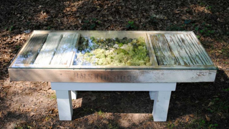Green moss grows in the centre of the table to create a striking composition when it’s paired with polished river rocks. The lines in the reclaimed plywood work to create a modern and interesting interplay against the worn edges of the aged split rail.