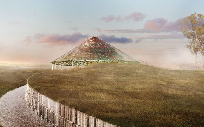 The project, which is located on a hill, will provide a panoramic view of the farm’s natural landscape and Donum’s 50-strong open-air sculpture collection.A path lined with glazed bricks has been carved into the slopes leading to the pavilion, eventually taking guests to a point where the wall reaches eye level, surrounding them with ground-level turf.