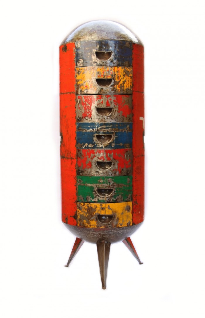 The furniture pieces, ranging from chairs to cabinets, stools and tables, retain a patina of previous incarnation while being transformed into contemporary, clean furniture.