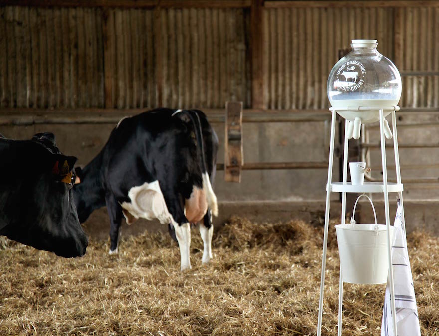 5.5 Design Studio has created the “Vache à Lait” (Milk Cow) to help users reconnect to the natural processes by which animal produce comes to our tables. Their playful design requires consumers to extract the milk as you would from a cow’s udder.