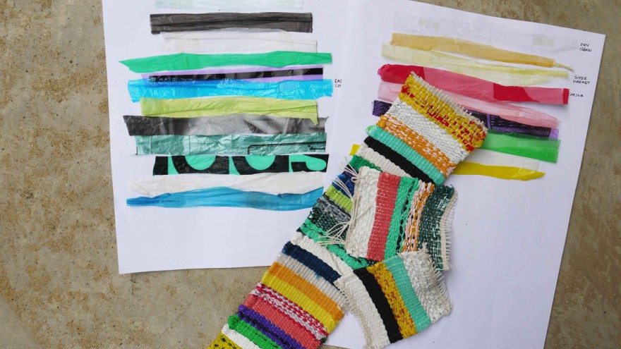 Plastex is made from reused plastic bags and recycled cotton threads. Plastic bags are collected, sterilised, cut, and interwoven on a manual handloom.