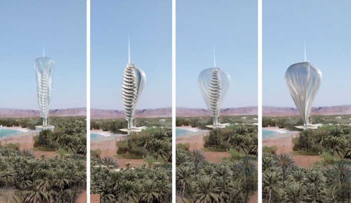 According to the firm, the shielding layer generates a buffer air zone that protects the building facade from the outside heat. The parachute veil is layered over a super-pressure balloon which crowns the tower. The size of the balloon changes according to needs, allowing the buffer air zone to increase in size or retract.