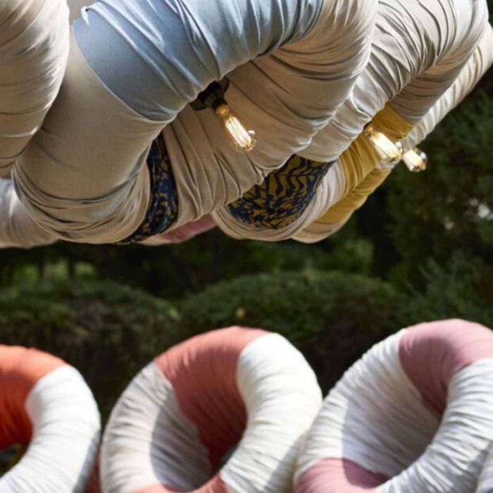 Drawing inspiration from Korean heritage and reflecting on how the circular economy is part of traditional Korean cultures, the design of the pavilion incorporates two traditional Korean elements: bojagi and norigae. Bojagi is the traditional Korean fabric used to cover, wrap and transport any household item, food or gifts; often serving as reusable gift wrapping, it can be made from a single piece or small pieces of fabric stitched together like patchwork quilt. Norigae is a Korean knot-tassel decorative pendant or good-luck charm worn by women. Using donated outdoor fabric, the design team wrapped the rings bojagi-style, while the design of the suspended rings emulates dangling norigae.