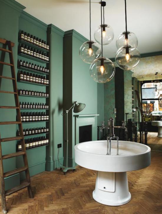 "We do not subscribe to claims of anti-aging, promises of youth and distorted ideas of beauty but offer plant-derived ingredients that contribute to the positive treatment and maintenance of skin and hair," says Dennis Paphitis, the founder of Aesop body products. Tasked with designing the Aesop shop, Design Indaba alumnus Ilse Crawford translated these values by pairing modern interventions with an endearing revival of pitch pine floors, brass finishes and tweed upholstery. This central ceramic sink was installed to emphasise the ritual of cleansing.