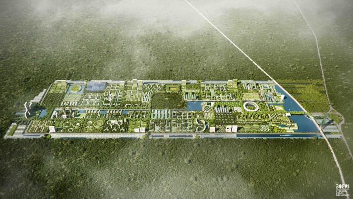 “The use of water, (one of the project’s key elements) which is collected at the entrance to the city in a large dock and a desalination tower and then subsequently distributed via a system of navigable canals allowing its distribution throughout the inhabited areas and the irrigation of the surrounding agricultural fields.”