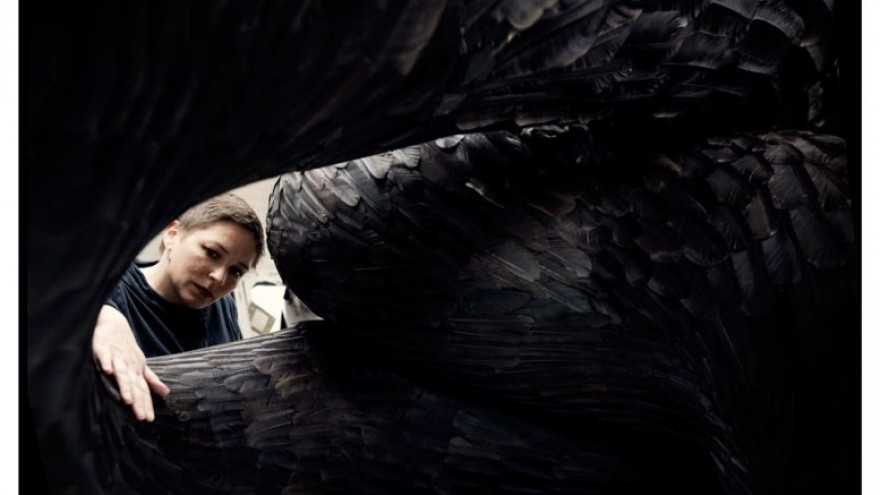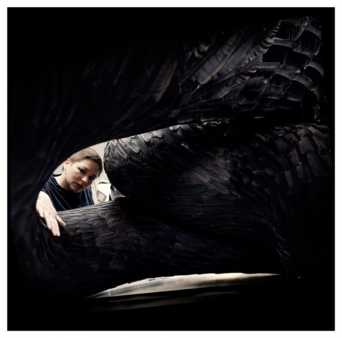 Thousands of feathers are used to create the desired effect. These MccGwire sources from farmers and pigeon racers, washing and sorting them before turning them into massive installations.