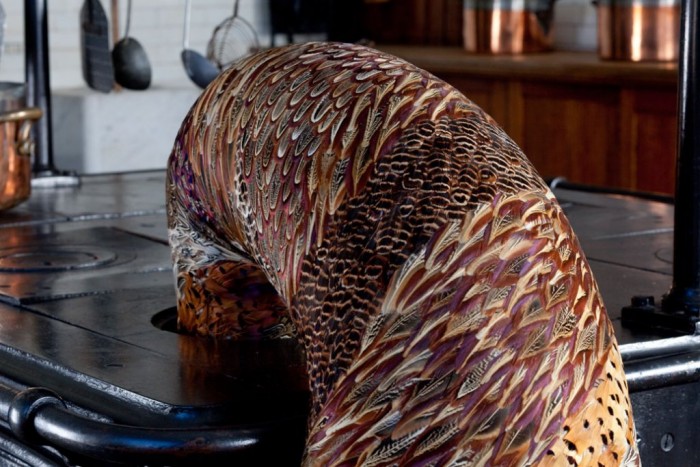 The London-based MccGwire creates surreal installations that incorporate the surreal into the everyday. There’s the large feather-clad “creature” that comes crawling out of a stove and serpentines that emerge from a fireplace.