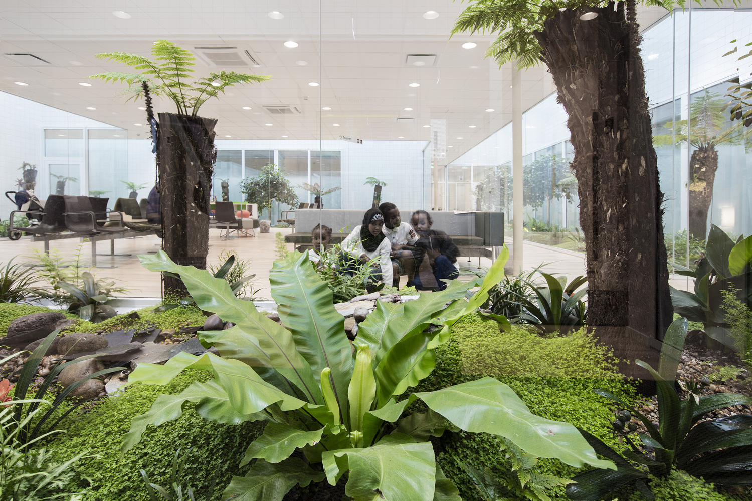 Because of Somalia’s typically arid climate, Wingårdhs designers added four walls of dense, damp and excessive vegetation to the clinic's waiting area. The thought behind this was the idea of paradise imagined as a flourishing garden for those from a dry country and was inspired by the garden of Eden. “It was [team leader] Gert Wingårdh’s idea,” explains architect Christer Andersson. “There is a Somalian tale that paradise is a place of fertile greenery that lies on the other side of the Gulf of Aden. It conveys a sense of calm and harmony."