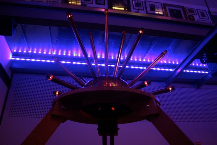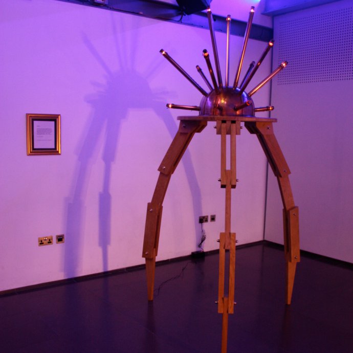 Two sculptures comprise the installation, the “Red Shift” and the “Shape of the Universe”. The first of these is an arrangement of illuminated copper tubes emanating from a central hemisphere that illustrates the frequency shift, which occurs in light as it travels through space. The second is a planished copper surface with a micro-etching of a solar system that aims to represent one of the possible shapes of the universe, that of a curved saddle.