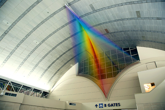 The artwork is made of nearly 90 miles of dyed thread and is suspended high between the wall and ceiling of San Antonio airport’s otherwise monotone B-gate corridor. The project was commissioned by Blue Star Contemporary and will remain on display until 2019.