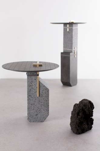 In homage to Ettore Sottsass, the great maestro of Italian design, the duo’s new body of work takes on a linear, even brutalist form. Geometric volumes have been carved from basalt and combined with fissure-like structural brass elements to produce stools, coffee tables and a clock. Lavic glass, produced by re-melting Mount Etna’s rocks have been mouth-blown into unique vessels or cast into box-like structures that allude to the illegal dwellings developed at the foot of the volcano. By returning these rocks to their original molten state, Studio Formafantasma reverse the natural timeline of the material and forge a dialogue between the natural and the manmade. A black mirror suspended on a brass structure ad balanced by lavic rocks continues this line of narrative.