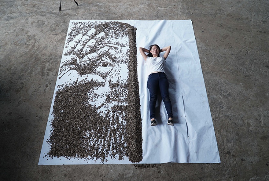 Upon a large white canvas, Hong Yi built the portrait seed by seed. She managed to successfully capture his features in tremendous detail – an unsurprising feat to those who are familiar with any of her previous work. From socks and flower petals to used tea bags and melted-down candles, Hong Yi’s utilisation of ordinary objects to create intricate artwork challenges our own understanding of objects and image-making.