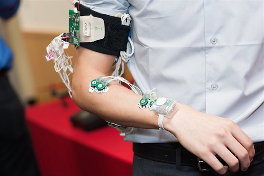 The second sensor is used to differentiate between different muscle activities. It is called an electromyographic sensor (sEMG) and it non-invasively measures the electrical potential of muscle activities, Jafari explains.