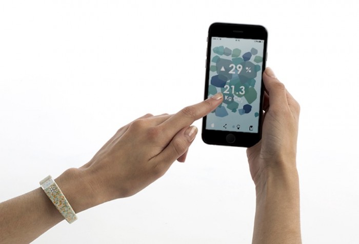 The wearable is made of recycled e-waste, of which the human race creates up to 50 million tons per year. The colour of the band communicates it’s composition: “It was a conscious choice. The device is made from recycled materials and we wanted to make it speak about being responsible, instead of falling into the category of other wearables.”