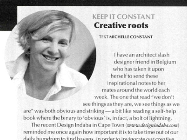 The recent Design Indaba in Cape Town reminded me once again how important it is to take time out of our daily humdrum to find havens, in order to invigorate our creative senses with a few 'bolts' and some 'obvious'. Who wouldn't want to be told, "stop working, start living", "there is best and then there is better practice" or "fail harder"? ...