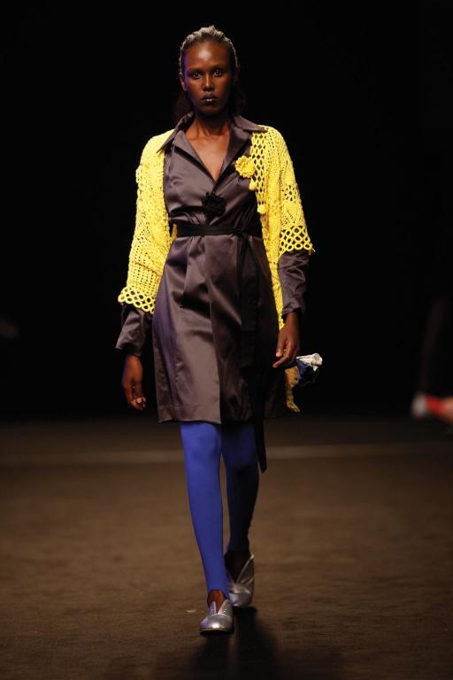 The range was divided into two parts and included as many real people on the ramp as it did models. In the first half I showed more wearable garments in bright colours; this represented the first 10 years of democracy, displaying the euphoria of averted civil war, the optimism of new beginnings and the hope for things to improve. The model sequence alternated a professional with a real person - i.e. people not normally found on the ramp. I wanted to express real life and show characters from different professions in our country - included were a lawyer, yoga teacher, IT specialist, intellectual student, professional ballet dancer, fashion stylist and others. These people sat on the ramp on two benches, watching the models - which was about pre-democracy people waiting for reality to happen. The styling of the clothes in this section was more casual and wearable, reflecting everyday life.