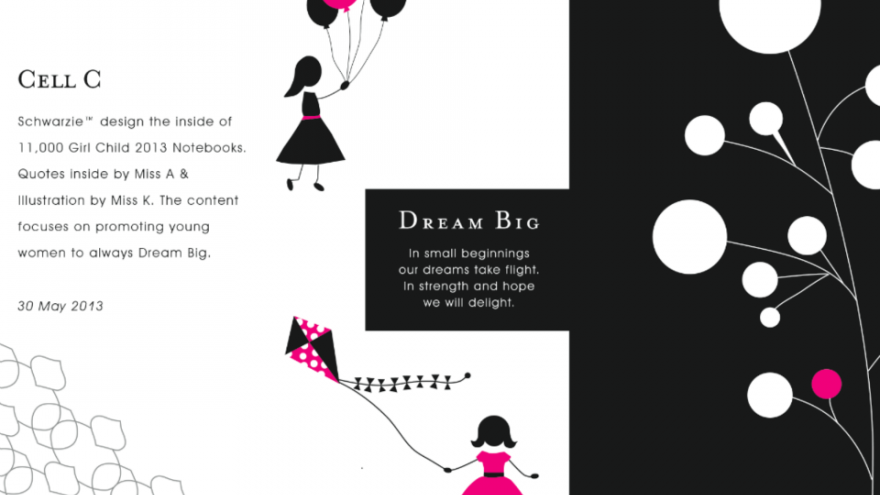 For Cell C the sisters presented the mobile network with the option to include a special story in the notebooks that the initiative hands out to participants, with the story focussing on encouraging young women to “Dream Big”. The final notebooks had a special Schwarzie-authored story inside with an illustration of a girl holding balloons, together with a relevant quote, interspersed throughout the notebook. “This was one of those projects where we could just be us”, Astrid explains, this campaign around empowerment being completely in line with their own vision for the Schwarzie brand.