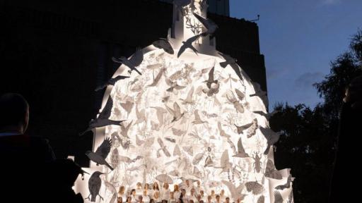 British designer Es Devlin created a cathedral-like structure illustrated with pencil drawings of London’s 243 endangered flora and fauna species.
