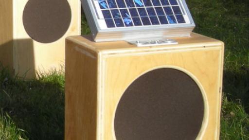 Speakers that look like washing machines with solar panels attached to them in the middle of the desert?