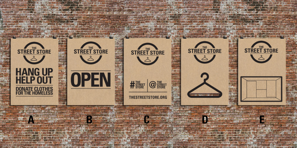 Open-source poster designs can be downloaded from TheStreetStore.org. Once printed, the designs are assembled and used as hangers and place mats to hold clothing donations. The donated items are hung on an outdoor fence for the homeless to browse through.