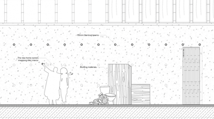 After two years this bamboo fence can be harvested for use in the building and a portion donated to the construction of a neighbouring home. In this way an essential element in the creation of a home now also becomes a valuable commodity.