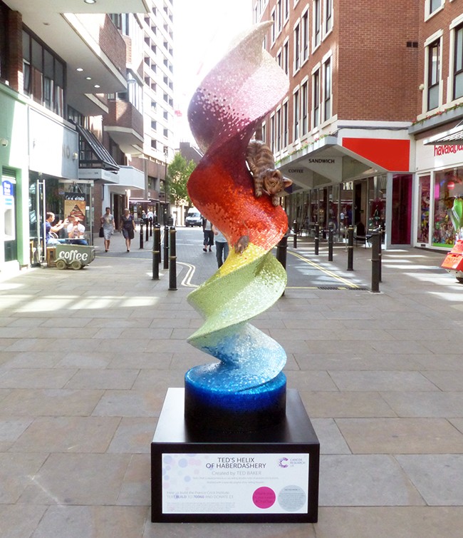 The 21 giant helixes form the What’s in your DNA campaign a collaboration between artists and Cancer Research UK, who are raising funds for a progressive new research facility. Leading artists, designers and sculptors were asked to produce a DNA double helix based on how they might envision their own genetic material. The result is multiple sculptures of a single form uniquely designed through the artist’s vision.