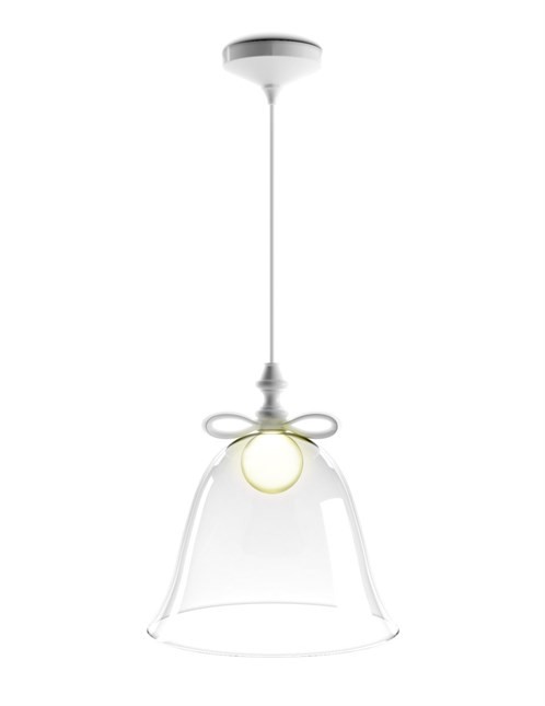 The Bell collection is available as pendant or floor lamps, and although they differ in format, materials and finishing, their bell-shape shades are all decorated with a festive ceramic bow.