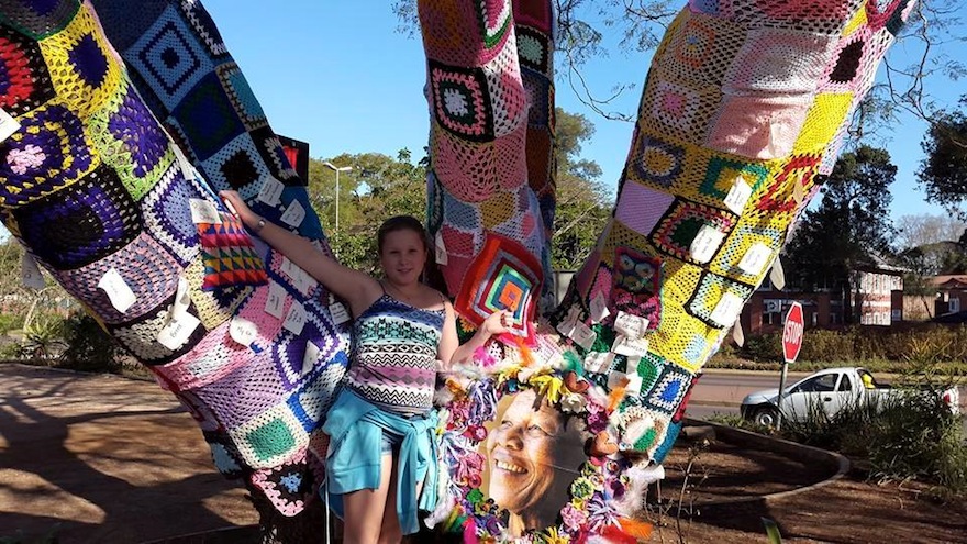 Woza Moya & Friends yarn-bombed a huge Jacaranda Tree outside the premises of the Hillcrest AIDS Centre Trust to raise awareness and funds for their Respite Unit on Mandela Day. The tree is called the Hero Tree. Companies and individuals made donations to the Hillcrest AIDS Centre Trust and had the hero's name (the donors) written on a piece of material and pinned onto the Hero Tree.