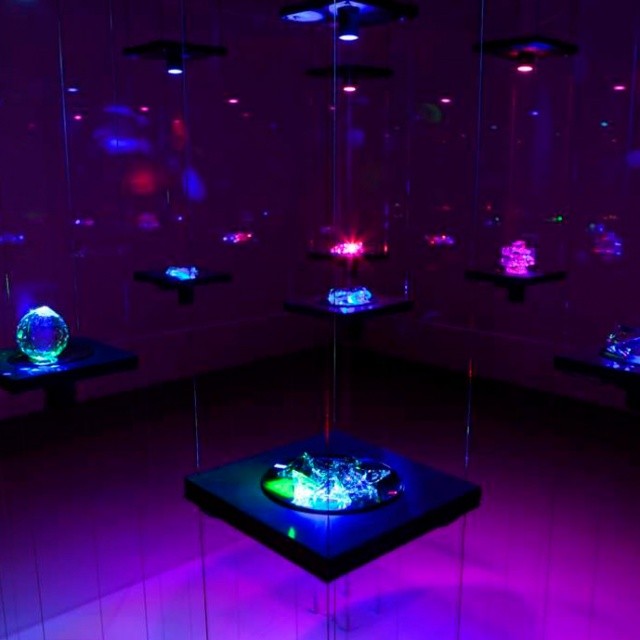 The crystals that are displayed on these disks are illuminated by floating multi-coloured LEDs, with a colour and sound sequence that is constantly changing.